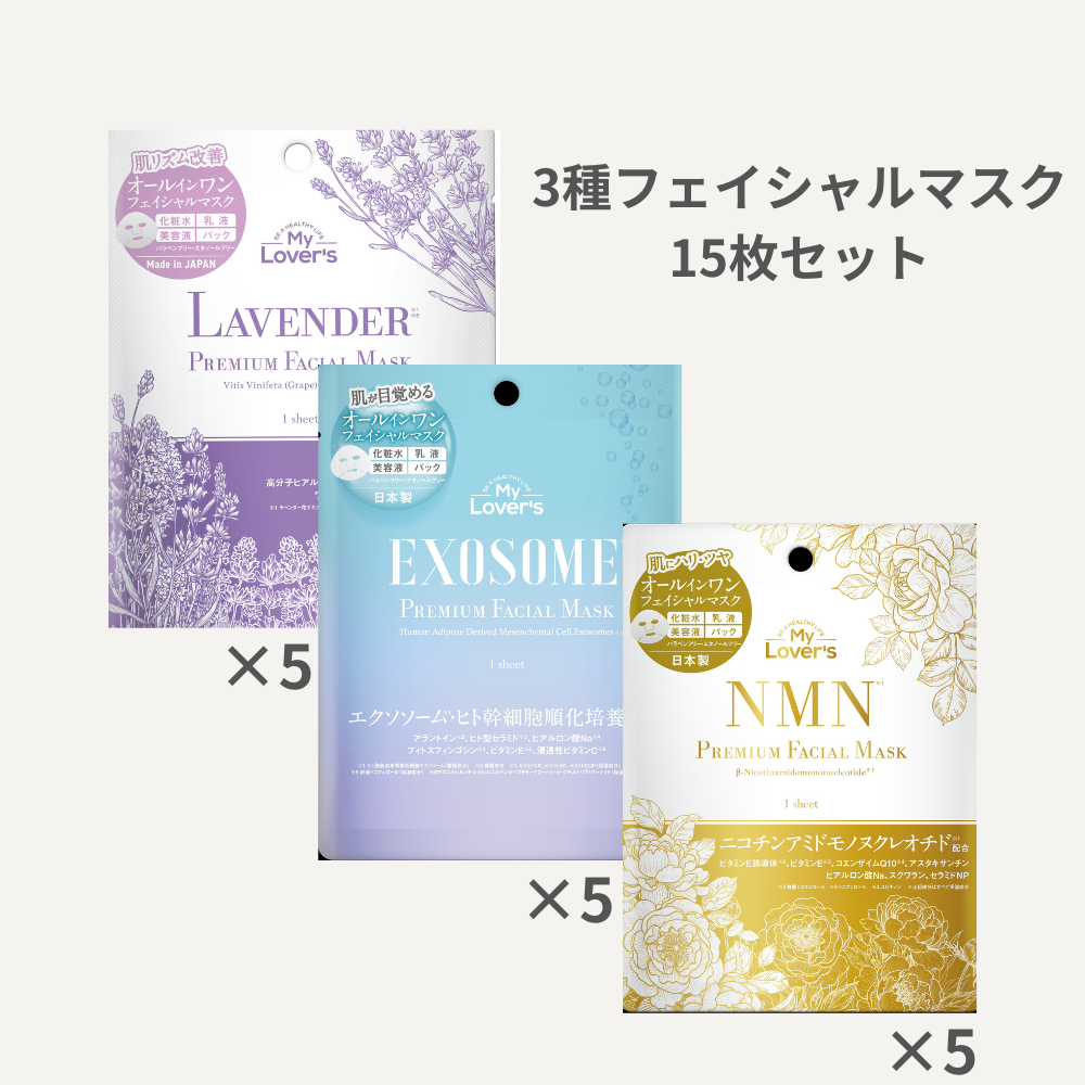 3種フェイシャルマスク 15枚セット(ラベンダー/NMN/エクソソーム 各5枚)