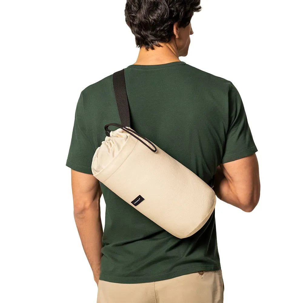 肩にかけれるキャンパス生地のトラベルバッグが付属しており、くるくる巻いて収納できるので、いつもの快眠を持ち運びできます。